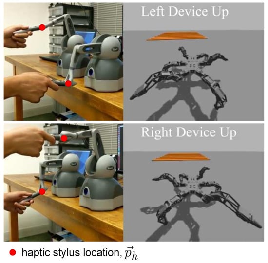 The physical operator station also consisted of the Sensable PHANToM Omni® 3DOF haptic devices and a desktop computer. In the presented method, two Omni haptic devices were utilized—one for each set of three legs per phase of the walking tripod gait. Kinesthetic force-feedback from the haptic devices encouraged the users to command efficient hexapod movement. In terms of system hardware, the operator interface machine ran with a dual-core 64-bit Intel® Core™ i7-640M running at 2.8 GHz using the Microsoft Windows 10 operating system. The machine was equipped with 4 GB of system memory, and a graphics engine consisting of a NVIDIA NVS 3100M with 512 MB of GDDR3 64 bit memory. With regard to baseline software, haptic device setup files for calibrating and interfacing with the devices were necessary. The Computer Haptics and Active Interface (CHAI3D) SDK was implemented to both gather haptic device configuration and generate appropriate force feedback. This is in contrast to whole-body methods [54,55,56]. Communication between the operator console and the simulation platform was achieved via a rosbridge node using TCP/IP.