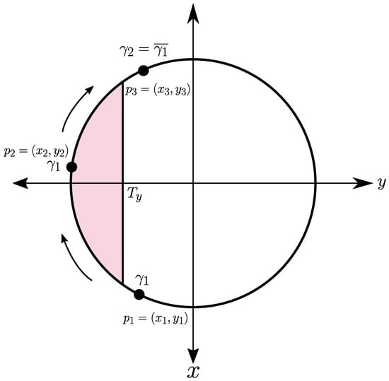 Pivoting phase is determined solely by transitions from outside to within the shaded region, determined by . As the commanded position coordinates shift from to , the cursor enters the shaded region and the y position is less than . When the cursor next leaves the shaded region, for example to , the phases of the rotation is toggled, which alternates which set of three legs are raised.