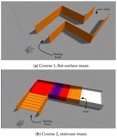 In this experiment, subjects were tasked with navigating the hexapod through two different courses. The first course consisted of a flat surface and two ninety degree turns, while the second consisted of a series of ascending and descending staircases and one ninety degree turn. The task courses are shown in Figure 8. Starting lines and locomotion end goal areas were clearly demarcated in both of the task courses.
