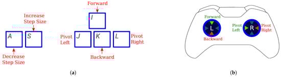 This interface incorporates the use of a handheld gaming controller. The components utilized are the left and right joystick, as depicted in Figure 9b. In this setup, the step size or speed is modulated by how far the user pushes the left joystick forward or backward. The further the joystick is displaced, the faster the robot walks. The pivoting motion is controlled by the right joystick. Similar controllers are used to control the Endeavor’s PackBot [57] and Auris Monarch surgical robot [58].