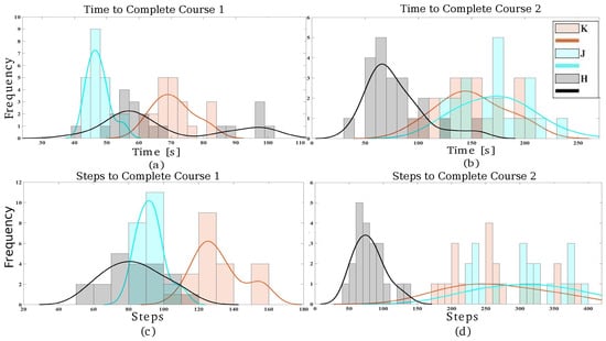 While the measures are hypothesized to be correlated, the latter may be more indicative of energy consumed in the navigation task. Both metrics were measured for each trial starting from the first step past the starting line and ending with the first step into the goal area.