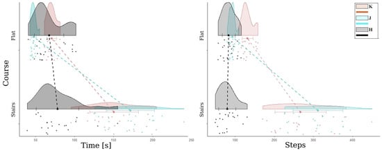 Performance robustness to increased task complexity. Left plot shows performance shift in time to completion, right shows performance shift for number of steps. Pink indicates K, blue indicates J, gray indicates H.