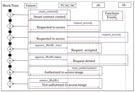 Figure 4 illustrates such parameters as the block/timeline, functions, and event sequence defined in the PCAC-SC protocol for granting and revoking permissions between a patient and image requestor IRs entities. To allow for better understanding of this access sharing sequence, we consider an example of two IRs: a doctor () and a general practitioner () who is interested in accessing a patient medical image.