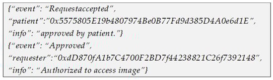 In this testing, we consider the first case, where a patient approves the address to access medical images by mapping with the IPFS hash value. Events requestaccepted and approved were triggered by approved_IRs() function, and gained access privileges to a patient medical image. The event is stored in the blockchain as shown in Figure 6.