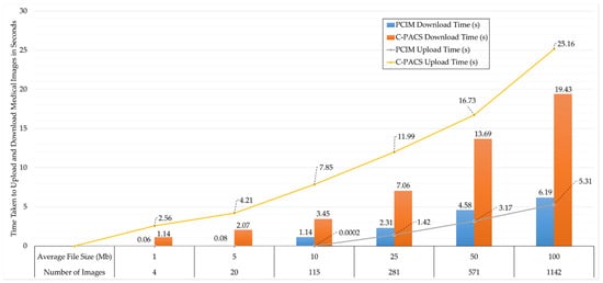 For this experiment, we set up the conventional cloud-based PACS (C-PACS) using PostDICOM [35], which uses Amazon S3 to store the medical images. We evaluated the efficiency of image access time by comparing the PCIM storage system with the C-PACS based on two parameters: the number of submitted images, and the size of the stored medical images. The measurement of the performance was based on the following metrics: upload and download time of medical images. We obtained anonymized sample images from the DICOM library dataset [30] to verify the image access time in Seconds. The experiment was performed on our local computer with an internet download speed of 272.19 MBps and an upload speed of 55.92 MBps. The medical image size range from 1–100 MB is uploaded to our distributed IPFS network and conventional cloud network and then downloaded the images to the local computer. The upload time for PCIM is observed when medical images get stored into the IPFS network and download time is observed during the medical images accessed using the IPFS hash value stored in the blockchain. Figure 10 shows the time taken to upload and download the medical images using the PCIM and C-PACS storage. The line graph shows that the proposed system takes less than 1 s to upload 4–115 medical images and takes 5.31 s to upload 100 MB of medical images. Whereas, the C-PACS system takes nearly 8 s for uploading 10 MB of images and it continues to increase as the image size reaches 100 MB. The bar graph in Figure 10 shows that within 6.19 s 1142 medical images are downloaded by the proposed system and C-PACS takes 19.43 s to download similar number of images. As evident from the figures, we can see that the medical image access time of the PCIM storage network outperforms the conventional cloud system. As expected, the proposed approach is faster due to its distributed operations. The traditional storage system is a complex process due to the centralized server, queued transactions, and privacy issues. In general, the experiments show that the IPFS based storage solution is robust and possible to access all the images faster and without any interruptions.