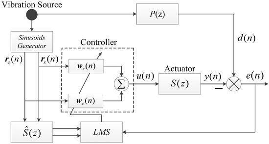 The NFXLMS algorithm is a variant algorithm of FXLMS subject to narrowband noise and vibration control. It combines the trigonometric formulas with the FXLMS algorithm and can reduce the control effort dramatically [22,23,24,25,26,27,28]. It not only benefits from the real-time applications but also facilitates the manipulation of the line spectrum for some special purposes, such as the active noise equalizer and line spectrum reshaping [29,30,31,32,33]. The diagram of the NFXLMS algorithm is shown in Figure 2.