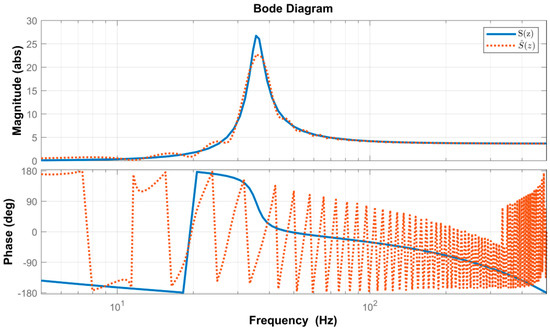 A SDOF (single-degree of freedom) active vibration isolation platform model using an electromagnetic actuator has been chosen for the numerical simulation research [34,35,36,37,38]. The platform model is shown in Figure 3. is the disturbance force acting on the base. It is detected by the sensor as a vibration signal and fed into the controller. and are the response force of and the control force generated by the AVC system. is the residual vibration detected at the test point by an accelerometer sensor. The meanings and values of the rest parameters are illustrated in Table 1. The secondary path from the drive signal to the acceleration response at the test point on mass m can be derived as Formula (22) [21]. Then, is transformed into the Z-domain as by using the zero-order hold method and a sample time of = 0.001 s (or a sample frequency = 1000 Hz), as shown in Formula (23). An FIR model with 128 taps has been estimated offline using the LMS system identification method with adaptation step size and a delay = 1at sample frequency [20,21,22,38]. The bode diagrams of and are shown in Figure 4. To simplify, the primary path is set to 1 in the simulation. The adaption step size and vibration source will be chosen according to different purposes.
