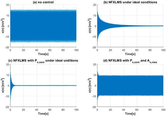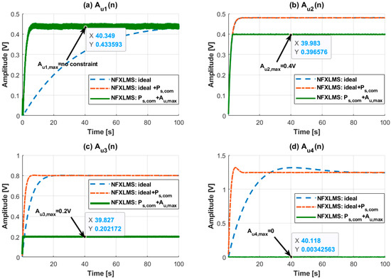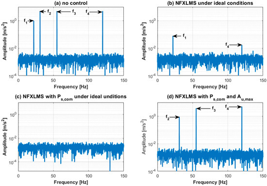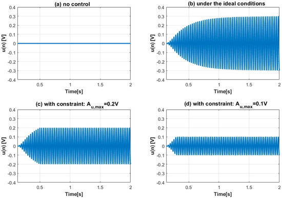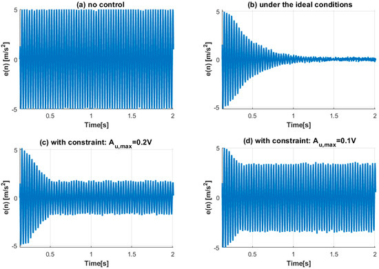 Figure 5 shows the simulation results of the output signal ’s time curve under different conditions: in Figure 5a no control is applied, which means = 0; in Figure 5b, the amplitude of the output signal grows to about 0.297 V under the ideal conditions via the NFXLMS algorithm; Figure 5b,c depicts that the amplitude of the output signal has been accurately restricted under the constraints = {0.2 V,0.1 V}. The relative errors of the control result are 1.5% and 1.35%, respectively. Figure 6 shows the time curve of the residual vibration under different conditions. Figure 6b depicts that the NFXLMS algorithm can reject the residual vibration to almost zero under ideal conditions while the constraints can maintain at a certain level in Figure 6c,d. The smoothness of the proposed algorithm triggering process can also be seen in Figure 6. The spectrum of the residual vibration at a steady state is shown in Figure 7. Figure 7c,d depicts that no significant harmonics are introduced to the control system.