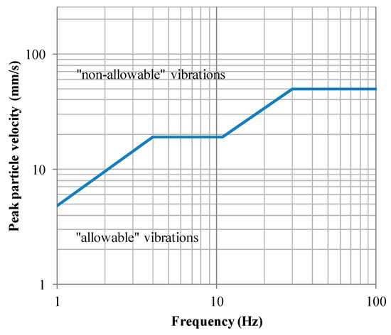 Vibration standards are typically plotted graphically using logarithmic scales in both vertical and horizontal directions. The peak particle velocity (m/s) is presented on the vertical scale and the vibration frequency (Hz) is on the horizontal scale, as shown in Figure 1 [28].