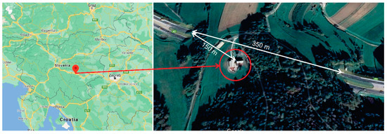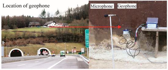 During the construction of the 7.6 km long motorway section Pluska–Ponikve (Slovenia) two tunnels had to be built. Above the tunnel tube was a house, which was exposed to vibrations due to the blasting (Figure 2). Therefore, the vibration levels were monitored. The house had a basement and two upper floors. The load-bearing walls of the house were built using stone and lime mortar with an estimated compressive strength of 0.5 MPa. The floors were built from reinforced concrete slabs. The facility where the monitoring was performed is shown in Figure 3.