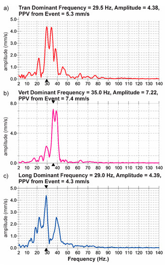 Records of vibrations caused by blasting event. (a) transverse vibrations, (b) vertical vibrations and (c) longitudinal vibrations.