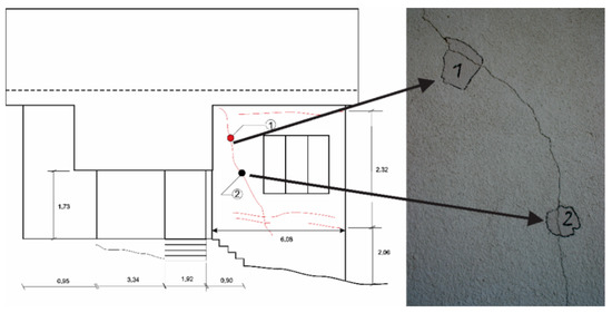 The measurements of vibrations induced by blasting in the tunnel tubes were obtained using Minimate Plus (Instantel) measuring equipment with a triaxial geophone, which was placed on the load-bearing wall of the building at the height of 0.6 m above the ground. A continuous record mode was used to record multiple events automatically with no dead time between blast events. The geophone records a blast event and then continues to monitor, ready to record the following events. The geophone records all blast events with a PPV exceeding the 0.2 mm/s. The blasting in two tunnel tubes was carried out from March to the end of July 2008. During this period, there were 48 measurements of blasting events. On the wall of the building, the PPV was measured in the longitudinal, vertical, and transverse directions. For each blasting event, the vibration frequency, amplitude, and peak particle velocity were recorded, as can be seen in Figure 4. The deviations of the fundamental natural frequencies can influence the structural strength of the building. However, for failure mechanisms such as bending and shear, where the building is forced to follow the oscillatory movements of the ground surface, the deviation of the fundamental natural frequencies of the building is of minor importance [31]. Table 3 presents the measurements of 40 of the blasting events that were used to define the site constants K and B (training data), while Table 4 contains the remaining eight measurements that were used to evaluate the prediction capability of the conventional vibration predictors (testing data). Before the blasting of the tunnel tubes, the 7 cracks were found on the outer walls of the building (see, Figure 5). We mapped the cracks and measured their width. The movements or displacements of these cracks were observed with installed plaster seals. During the blasting, it was revealed that the cracks did not enlarge, and no new cracks formed.