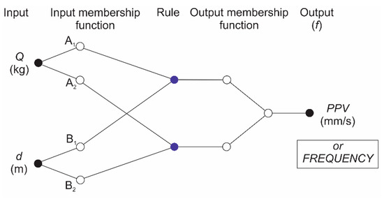 The structure of the f model, for each f ϵ F, is presented in Figure 6. The nodes on the left side represent the input variables and the node on the right represents the output. Each model contains two input variables, namely the charge Q (kg) and the distance d (m) from the point of measurement to the center of gravity of the blast, as well as a single output. In this way, two ANFIS models predict two different outputs, such as the peak particle velocity (mm/s) and the frequency (Hz).