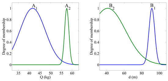 In a basic FIS, the integer number of rules is determined by an engineer/researcher who is acquainted with the engineering problem to be modeled. There are no straightforward procedures to determine the lowest possible number of membership functions in order to obtain a required level of performance. In this paper, the number of membership functions determined for each input variable was chosen systematically by analyzing the input–output data and by using the trial-and-error method. For each f ϵ F, for the f prediction model, we chose two membership functions in each input. Figure 7 shows the membership functions for Q and d for the prediction model PPV. All the integrated membership functions were Gaussian, expressed by Equations (7) and (8). Several researchers reported that Gaussian membership functions performed best among all given membership functions [42,43].