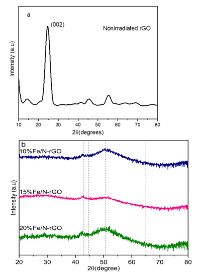 The X-ray diffraction (XRD) patterns of the nonirradiated rGO and the irradiated Fe/N-rGO are presented in Figure 1a,b, respectively.