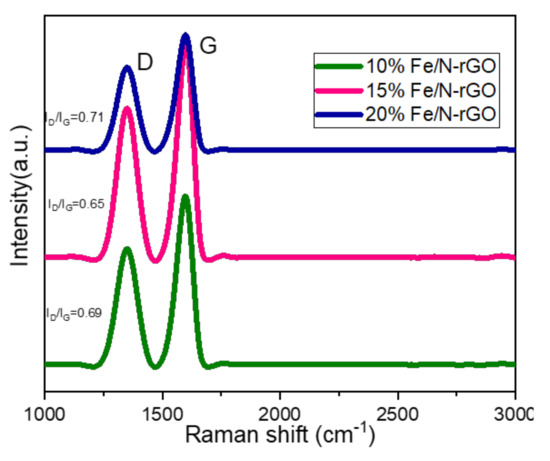 Raman spectroscopy was performed to characterize the samples and elucidate the carbon structure. In Figure 2, all the samples possessed two characteristic peaks at ~1348 (D band) and ~1598 (G band) cm−1. The 2D band intensity of rGO and GO normally appears at around 2700 cm−1 but it was completely absent in all the three samples in this study. The absence of the 2D band intensity confirmed that the structure had high amount of defects. The 2D peak intensity depends on electron doping and structural disorders [32,33]. In our study, the D band resulted from structural imperfection caused by the presence of the disordered carbon and the G band was attributed to the E2g vibration of carbon atoms. The intensity ratio of the D and G bands (ID/IG) was used to estimate the defects of the samples. Our results revealed that 10% Fe/N-rGO, 15% Fe/N-rGO and 20% Fe/N-rGO had ID/IG of 0.69, 0.65 and 0.71, respectively, suggesting that 20% Fe/N-rGO had the highest amount of defects [18]. ID/IG is closely related to the sp3/sp2 carbon hybridization ratio. The sp2-hybridized carbon is assigned to the carbon graphitic structure, whereas the sp3 carbon hybrid is assigned to the bond between carbon and atoms such as nitrogen, oxygen and iron anchored on the carbon surface. Furthermore, 15% Fe/N-rGO showed the lowest ID/IG, suggesting that the low amount of Fe or few point defects [34,35,36,37] were introduced to the rGO structure. The result was consistent with the XRD results, which demonstrated that the lowest peak intensity among the three samples and the semi-quantitative EDS results reported in Table 1 reaffirmed the lowest Fe content of 15% Fe/N-rGO.