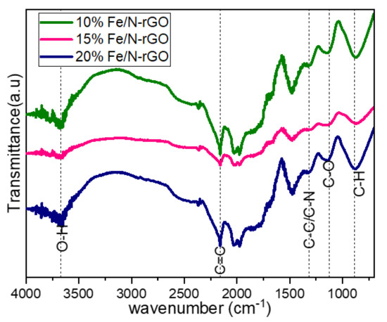 Fourier transform infrared (FTIR) spectroscopy was applied to determine the possible functional groups in the compositions. The FTIR spectra of the irradiated samples are depicted in Figure 3. All the three samples were composed of C–H (884.34 cm−1), C–O (1127.35 cm−1), C–C/C–N (1314.46 cm−1), C=C (2158 cm−1) and O–H (3668.94 cm−1). C–N stretching confirmed the existence of a N atom in the composition and formed a weak bond with a carbon atom. No sharp peak was observed in 15% Fe/N-rGO, indicating the weaker bond between the two atoms. Furthermore, 10% Fe/N-rGO and 20% Fe/N-rGO exhibited a slightly sharp peak. The C–N bond in 15% Fe/N-rGO almost disappeared. Previous studies revealed the C–O stretching peak between 1028 and 1308 cm−1, the C–H stretching peak between 500 and 1000 cm−1 and the O–H stretching peak after 3420 cm−1. The peaks of C–O and O–H respectively found at ~1127.35 cm−1 and 3668.94 cm−1 could be ascribed to the deformation of rGO [38,39].