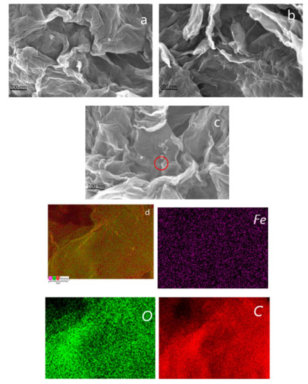 Field emission scanning electron microscopy (FESEM)-EDS was conducted to examine the surface morphology and distribution of elements. The FESEM images of all the three samples are presented in Figure 4a–c. The surface of all the three samples was rough, folded and wrinkled, indicating that GO was reduced to rGO. This observation agreed with the XRD pattern shown in Figure 1a [18,26]. A few nanoscale iron particles were detected on the rGO surface in the micrographs. The lack of iron particles was probably due to the confinement of nanoparticles in the rGO interlayer or the lack of nitrogen-anchoring sites on rGO. The element mapping of 20% Fe/N-rGO via EDS is shown in the circulated area in Figure 4c and the distributions of Fe, C and O are illustrated in Figure 4d. The respective semiquantitative element distributions of all the samples are summarized in Table 1 to estimate the Fe loading on rGO. Approximately 50% of the designed Fe in all the samples except in 15% Fe/N-rGO was embedded onto rGO upon irradiation.