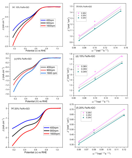 The LSV curves of 10% Fe/N-rGO, 15% Fe/N-rGO and 20% Fe/N-rGO are presented in Figure 5a,c,e, respectively and their corresponding K–L plots at different potentials are illustrated in Figure 5b,d,f.