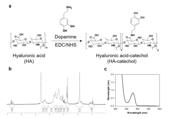 (a) Synthesis and chemical structures of hyaluronic acid (HA)–catechol. (b) 1H NMR and (c) UV–Vis spectra of HA–catechol.