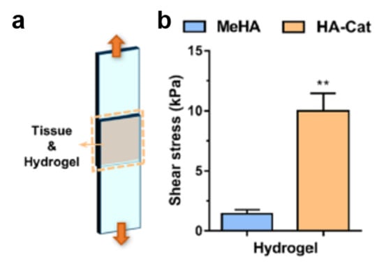 (a) Schematic illustration of a lap shear tissue adhesion test. (b) Average adhesive stress (kPa) of methacrylated HA (MeHA) and HA–catechol (HA-Cat) hydrogels (** p < 0.01). Reprinted with permission from [52]. Copyright © 2019 Elsevier.
