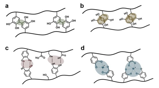 Schematic illustration of catechol-involving reactions of HA–catechol: (a) covalent bonds, (b) π–π stacking, (c) hydrogen bonds, and (d) metal coordination.