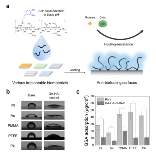 HA is a representative antifouling material mainly due to its hydrophilicity and its unique moisture retention and lubrication abilities. The catechol moiety of HA–catechol can form a thin film on substrates (Figure 4a). These HA–catechol coatings on Au surfaces enhance hydrophilicity (11.9° of water contact angle) compared to that measured on bare Au surfaces (81.6°) [40]. In addition, HA–catechol-coated Au substrates have extremely low protein-adsorption levels (<5 ng/cm2) for single proteins (i.e., bovine serum albumin, lysozymes, and β-lactoglobulin). Polyimide (PI), Au, poly(methyl methacrylate) (PMMA), polytetrafluoroethylene (PTFE), and polyurethane (PU) are coated with HA–catechol to prepare antifouling substrates [60]. All substrates coated with HA–catechol exhibit improved hydrophilicity of the substrates (less than 50° of water contact angle) compared to the unmodified substrates, as shown in Figure 4b. The adsorption of bovine serum albumin on HA–catechol-coated substrates was dramatically reduced to 22–46% compared to that on unmodified surfaces (Figure 4c). Therefore, HA–catechol is an excellent coating agent for the antifouling treatment of biomedical devices.