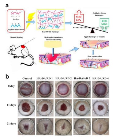 (a) Schematic illustration of methacrylated HA–catechol (HA–DA) and arginine derivatives (AD) composite hydrogels for wound healing. (b) Photographic images of rat skin wounds after treatments of HA–DA/AD hydrogels with various pore sizes (14.18 ± 1.54 μm for HA–DA/AD1, 13.09 ± 0.79 μm for HA–DA/AD2, 11.08 ± 1.16 μm for HA–DA/AD3, and 9.07 ± 2.17 μm for HA–DA/AD hydrogels). Treatment with PBS was used as a control. Reproduced with permission from [62]. Copyright © 2019 Elsevier.