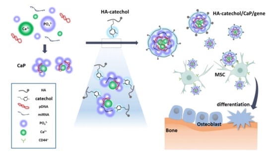 Schematic representation of an HA–catechol/CaP-based gene delivery system. Reproduced from [41] with permission from MDPI, copyright 2019.