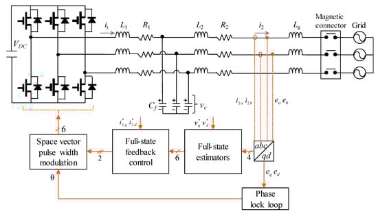 As another approach, a full-state feedback scheme is presented in [,,]. In these methods, the feedback control of the capacitor voltage and inverter-side current is used to actively damp the resonance phenomenon. The advantages of these control methods are that the design procedure is standard and straightforward, thereby getting rid of any trial and error. However, there are still some drawbacks such as the computational burden and limited harmonic compensation []. The multiloop control and full-state feedback control structures are known to have large flexibility and easiness in implementation [,].