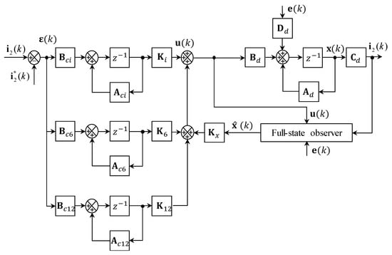 where  is a set of state feedback gains with . The detailed block diagram of the state feedback current controller augmented with the integral and resonant control terms is depicted in Figure 3, in which the closed-loop eigenvalues are obtained from: