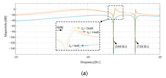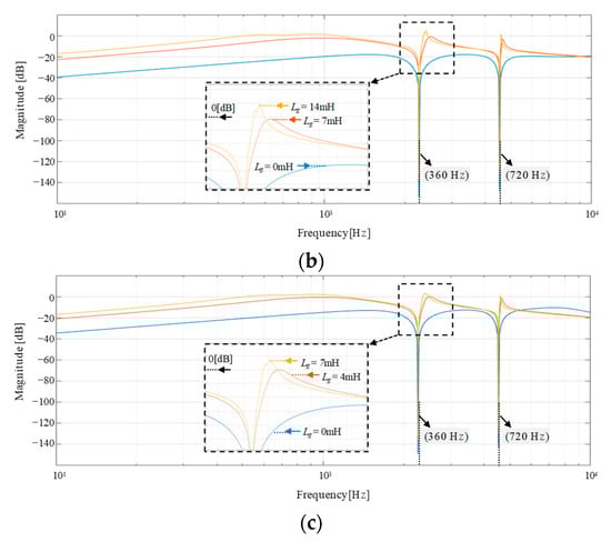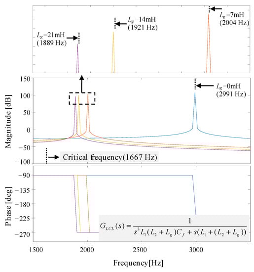 In this subsection, the influence of the grid impedance variation on the resonant frequency is presented. Considering that the series configuration of L2 and Lg is combined as L2g = L2 + Lg, the transfer function from the inverter voltage to the grid-side current is obtained from Figure 2 as [,]: