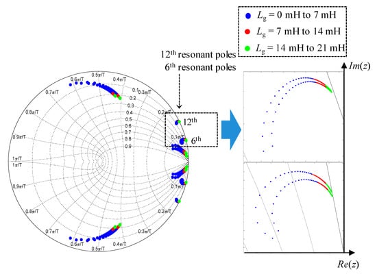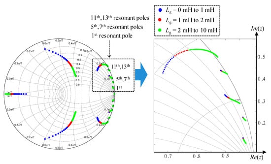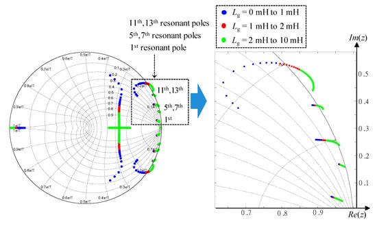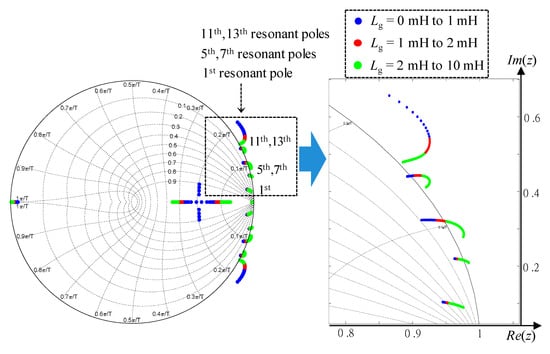 In this subsection, the impact of the grid impedance variation on the stability of direct grid current controller with capacitor current feedback active damping is discussed. The stability analysis of the closed-loop LCL-filtered inverter system is achieved by investigating the location of the closed-loop poles in the discrete-time domain. As shown in Equations (6) and (7), six gains are needed to be tuned in the direct grid current controller: the proportional gain at the fundamental frequency Kp1, and five resonant gains at the fundamental and selected harmonic frequencies Kr1, Kr5, Kr7, Kr11, and Kr13. The controller gains are selected in the stiff grid condition. Under weak grid, the closed-loop pole locations designed in the stiff grid move from the designed locations as Lg is increased.
