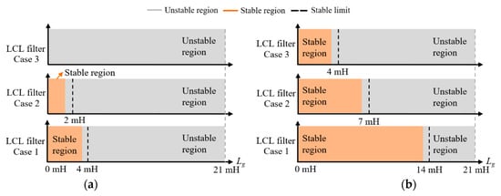 Comparison of the stability limit under the grid impedance variation for different LCL parameter sets: (a) Direct grid current controller; (b) Integral-resonant state feedback LQR controller.