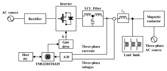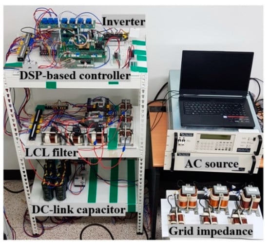 Commonly, the pulse width modulation (PWM) grid-connected inverters with a high switching frequency are widely used to deliver the power from the renewable energy resources to the grid. To achieve high-quality grid-injected currents which meet the stringent harmonic standard, harmonics around the switching frequency should be effectively filtered out. For this purpose, an inductive (L) filter with high inductance value can be used at the inverter output, providing the easiness in control design []. On the other hand, compared with an L filter, inductive-capacitive-inductive (LCL)-type filters are more attractive due to smaller physical size and better harmonic attenuation capability of high-order harmonics [,]. Nevertheless, the LCL filter introduces a resonant peak into the system, which may cause an output resonance problem [,,,]. To ensure a stable and reliable operation of the inverter system, a proper damping method should be considered either by the passive or active method. The study in [] focuses on the stability problem of the LCL-filtered grid-connected inverters for a large set of grid impedance value, in which the inverter-side current is controlled by means of a proportional resonant (PR) control scheme. As discussed in this paper, the conventional active damping, which highly depends on the knowledge of hardware system, is ineffective under the grid inductor variation in weak grid condition. In addition to the resonance problem, other issues such as the grid harmonic distortion and grid impedance at PCC should be addressed to produce high-quality grid-injected inverter currents [].
