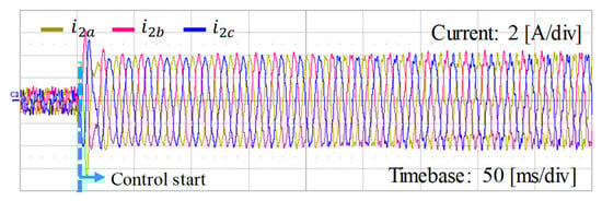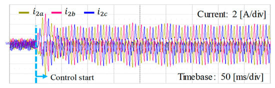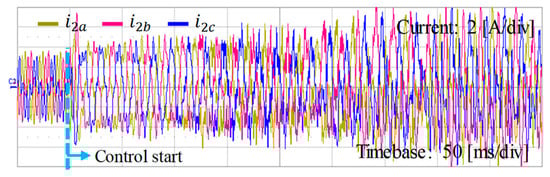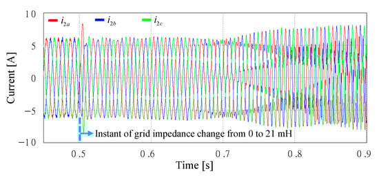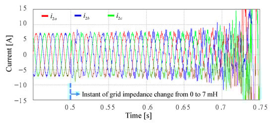 As the final LCL parameter set, low region resonance frequency of Case 3 in Table 1 is considered, where L1 = 1.7 mH, L2 = 1.0 mH, and Cf = 30 μF are given. The state feedback current controller is designed for the given LCL filter set to produce a good grid-side current at the stiff grid condition as shown in Figure 29. However, as presented in Figure 11, low region resonance frequency of the LCL filter is extremely sensitive to uncertainty caused by the weak grid condition, causing the instability by only small grid impedance change.