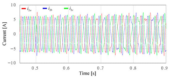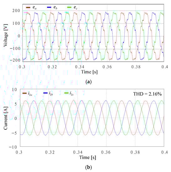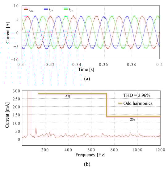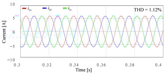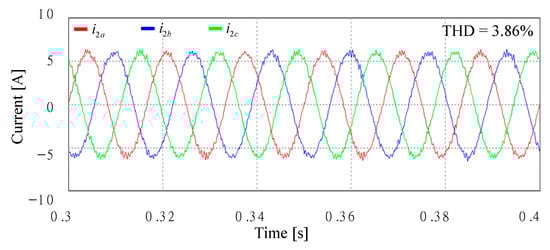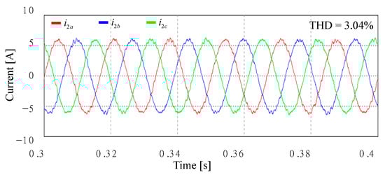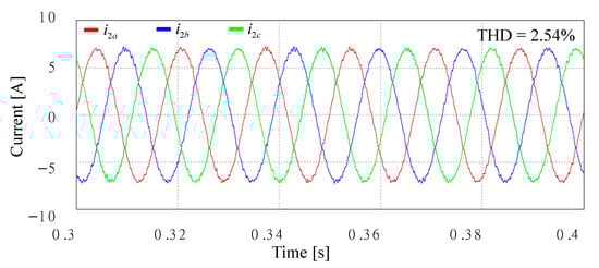 Figure 27 shows the simulation results with an extra Lg of 7 mH in Case 2 under the same voltage conditions of Figure 17a. As shown in Figure 10, the poles of the closed-loop current control still remain inside the stable region when Lg varies from 0 to 7 mH. As a result, high-quality sinusoidal grid-injected currents can be obtained, which well demonstrates the validity of the stability analysis. The THD value is much smaller than that of Figure 26 due to additional inductance.
