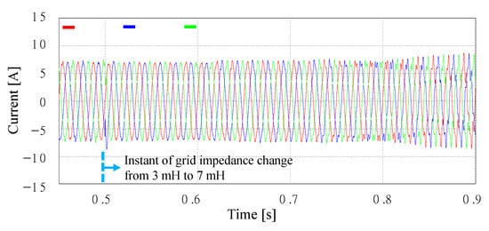 Figure 30 demonstrates this situation, in which Lg is suddenly increased from 3 mH to 7 mH in Case 3 at 0.5 s. While stable currents are observed with 3 mH of Lg, the change to 7 mH of Lg produces unstable grid currents.