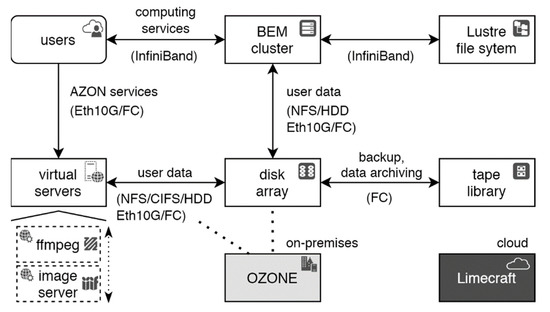 Disk array serves mainly as a data storage system. Its shares are made available through various protocols on the cluster and, through the virtualizer, to virtual machines performing multiple AZON platforms’ functions. In this way, the number of copies can be minimized, and the data transfer over the network can be limited. From there, archiving takes place, following established policy, using a dedicated FibreChannel (FC) network.