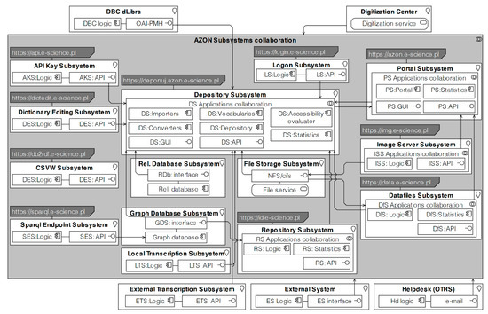 In the beginning, it was necessary to design an appropriate architecture for the AZON platform, especially that it was supposed to support the publication of 32,792 documents (assuming, for simplicity, that one document = one data record) that would require the dissemination of 124 TB of data. Moreover, according to the assumptions, increasing scientific resources’ availability should be automated, with batch processing of data performed in the computing centre. The platform was supposed to support data standardization, records annotation, voice transcription, search, linking, keywords definition, and text analysis. The designed domain metadata models, dictionaries, and thesauri should support the information dissemination and search.