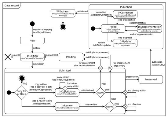 The automatic multimedia processing (processing of attached files to the data record) occurs when the data record reaches the Published state and its InSupplementation substate. The Supplementation block in Figure 4 represents it. However, the necessity of multimedia processing may appear at other states as well (data files have to be recorded, named, encoded and uploaded, converted to long supported formats, optionally anonymized, prepared for presentation and preview, etc.). These steps are intentionally not shown in the figure to preserve its clarity.