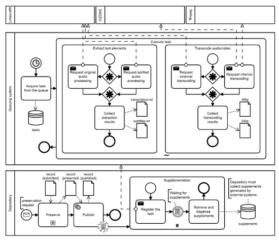 As depicted in Figure 4, several instances of Supplementation might be executed in parallel by the Depository Subsystem (AZON is a multi-access platform, and several users can submit their data records for publication simultaneously). According to the Supplementation block’s internal control flow, processing tasks are registered in the Queuing system, and results are retrieved and dispensed once specific business rules are met. The Queuing system does not process any multimedia by itself during queued task execution. Instead, it delegates processing to the external systems by sending proper requests (see Execute task block). Then it collects results.