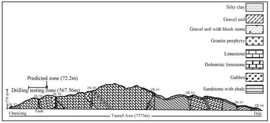The Jiudingshan Tunnel on the Chuxiong–Dali highway in Yunnan, China, is 7575 m long. The depth is 570 m, and the maximum excavation width is 17.34 m. The tunnel is located on composite site with various rock structures. Moreover, the tunnel has poor surrounding rock stability and passes through geology of poor structural competence, such as karst, a fault fracture zone, and a contact zone between limestone and granite porphyry. A geological survey was conducted; the geologic map in Figure 1 shows the boreholes. Since the tunnel is so long and the number of boreholes is limited, it was difficult to obtain a completer picture of the actual geological conditions prior to tunnel excavation. It was necessary to design the tunnel dynamically according to the geology prediction results, so advanced horizontal drilling testing was conducted.