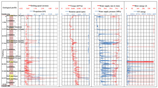 An RPD-180CBR multifunctional drill rig (KOKEN, Japan) was used for the horizontal advanced drilling testing. The drilling speed, torque, rotation speed, propulsion, blow energy, blow number, water supply rate, water supply pressure, and EV energy (i.e., the energy required to break out a unit volume of rock, is a function of blow energy, blow number, drilling speed, and bit diameter) data were recorded every 2 cm during the horizontal drilling. Actual geological conditions were recorded as tunnel excavation proceeded.