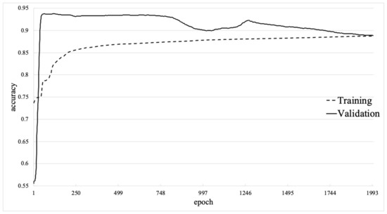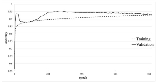 Figure 7, which shows the learning curve for 5000 epochs of training, indicates that the validation data accuracy curve and training data accuracy curve cross at approximately 815 epochs. By stopping the deep neural network training at 815 epochs, overfitting problems can be avoided. Figure 8 shows the learning curve for 815 epochs. Since no large gap was noted between the training set accuracy and validation set accuracy, the neural network model was interpreted as effective and not overfitted. The training set accuracy was 92.69%, while the validation set accuracy was 93.25%. Compared with the basic neural network, the predictive accuracy of the training set was 3.99% higher, while that of the validation set was 4.55% higher. Moreover, the deep neural network reached that accuracy for 815 epochs of training which is approximately 2.5 times more efficient than the basic neural network.