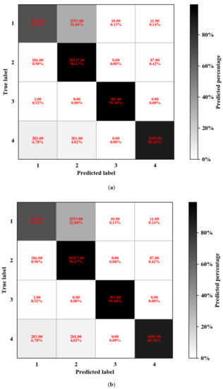 Figure 10 shows the confusion matrix for the training data. The diagonal elements represent the count of rock units whose types were perfectly predicted, while the off-diagonal elements indicate the counts of incorrectly predicted rock types. The deep neural network model performed better than the basic neural network for every rock type, and it showed higher accuracy overall. The basic neural network performed well in predicting label 2 (i.e., limestone; 92.23% accuracy) because numerous examples of limestone were encountered. The basic neural network performed poorly in predicting label 1 (i.e., fractured limestone; 47.13% accuracy), label 3 (i.e., clay; 47% accuracy), and label 4 (i.e., soft interlayer; 63.22% accuracy) because relatively little few samples were encountered for these rock types. The deep neural network confusion matrix exhibited higher predictive accuracy than the basic neural network for label 1 (67.69% accuracy), label 2 (98.67% accuracy), label 3 (99.48% accuracy), and label 4 (88.40% accuracy). In both neural network models, label 1 showed a relatively low predictive accuracy compared with the other rock types. The percentage of fractured limestone units incorrectly predicted as limestone was approximately 45.20% for the basic neural network and 32.04% the deep neural network. These high misidentification rates were likely due to fractured limestone and limestone ultimately represent the same rock compositional type under different structural conditions.