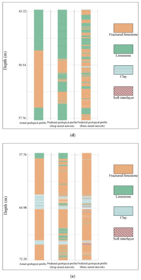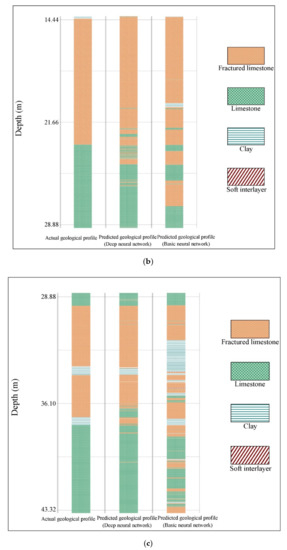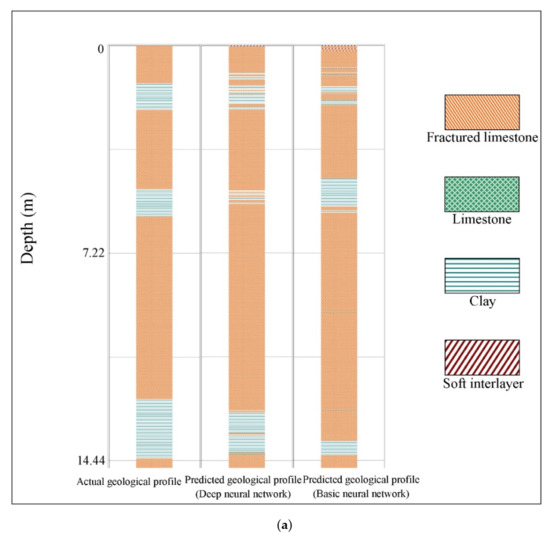 The trained basic and deep neural network models were used to predict geological conditions from 3611 data points of testing data obtained from a borehole into the tunnel face. The predictive accuracy of the basic neural network was 90.55%, while that of the deep neural network was 91.68%. Figure 11 shows a comparison of the predicted geological profile and the actual geological profile. The geological profiles predicted by the basic and deep neural networks both matched the actual geological profile quite well. The deep neural network model outperformed the basic neural network in predicting occurrences of clay and soft interlayers. For both neural network models, most of the incorrect predictions occurred at rock interfaces and weak interlayers. Some incorrect predictions occurred at interfaces between fractured limestone and non-fractured limestone units since fractured limestone and limestone ultimately represent the same rock compositional type under different structural conditions. The phenomenon is the same as that observed in the neural network training confusion matrix (Figure 10).