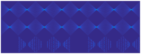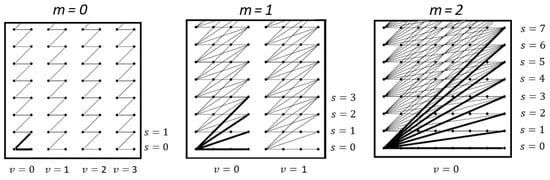 Notice also that the number of bits in partial stages is varying and depends on m, the current stage. When , the array is really bidimensional, as variable s is still empty, so maps directly to . And when , the last stage, variable v will be emptied, and so is the desired result . That can also be appreciated by evaluating the definition of partial transform, Equation (4), for stage : This last equation is none other than the discrete version of Radon transform as expressed in Equation (2) with multiplication with the slope substituted by discrete line interaction between u and s at binary level.