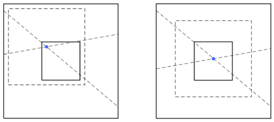 Two cases are represented left and right. Both show an inner square and an outer one marked by solid lines, as well as a dashed square in between. Let the side size of the external square be three times the size of the internal one. Marked in blue is a point in the inner square and two lines of the set of many that will be backprojected through it, represented with dashed pattern. The inner square represents the original size of our images: this used to be where the DRT backprojects. The length of the backprojected lines within the inner square clearly differs depending on the position of the point. If we manage to make our backprojection algorithm extend the lines up to the outer square, three times longer than the original, the backprojected lines will match in both cases when considering the dashed square around the dot, which is twice the size of the original.