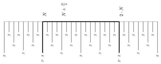The bits boundaries of the slopes for the extended DRT that we propose are shown in Figure 5. The N original data are located between positions N and when the domain is extended to . The figure shows those positions, as well as additional values to each side.